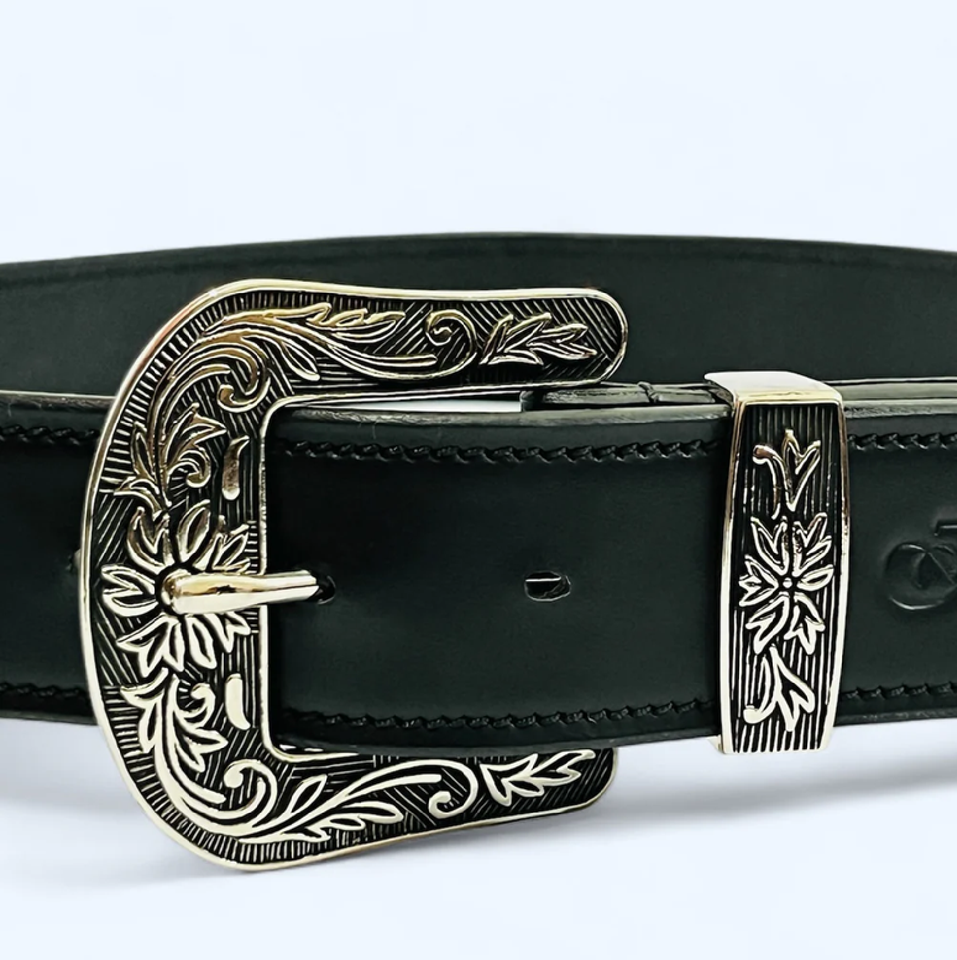 Black leather belt with large ornate floral silver buckle and matching loop. Available at wholesale prices.