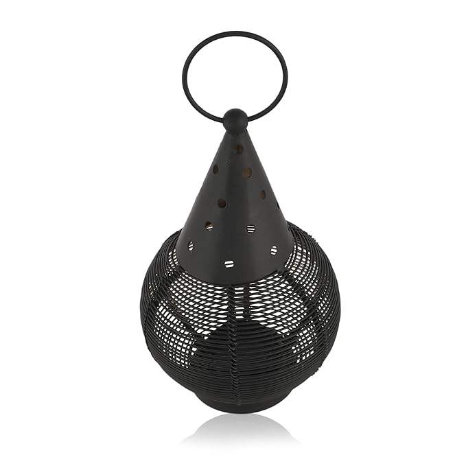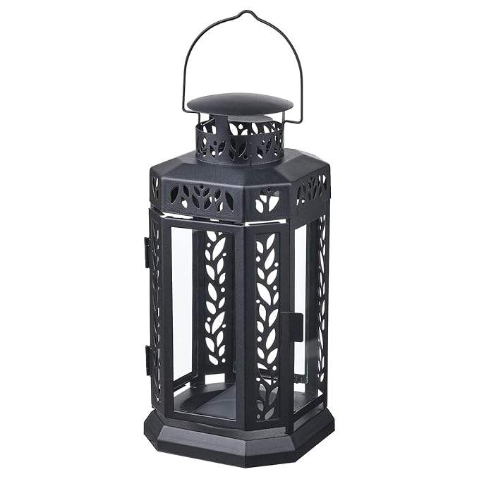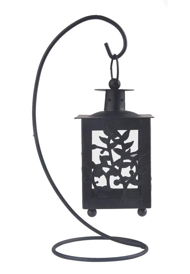 Black metal candle lantern with handle and hinged door perfect for entryway lighting or rustic wedding centerpieces