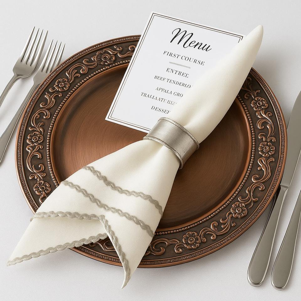 Black metal charger plate complemented by a free decorative napkin ring ideal for upscale table settings and kitchen collections