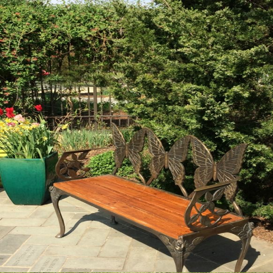 Black metal garden bench, butterfly scrollwork design, outdoor seating, garden furniture, available at wholesale price.