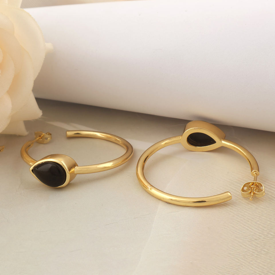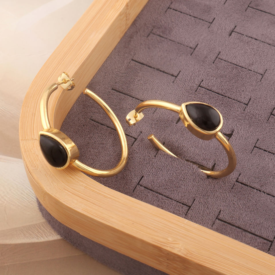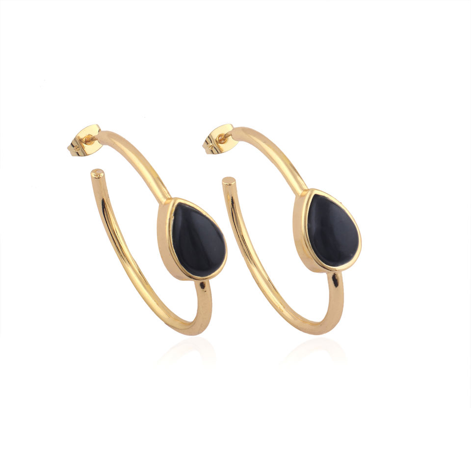 Black onyx smooth pear gemstone bezel set hoop earrings 18k gold plated brass handmade jewelry for party wedding gifts