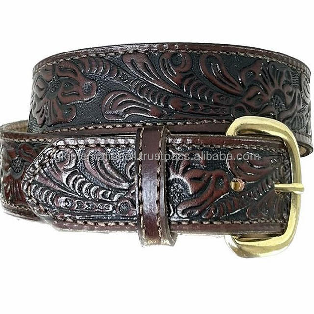 Black or Brown High Shine Hand Carved Floral Embossed Western Leather Tooling Belt with Stylish Brass Pin Buckle All Sizes