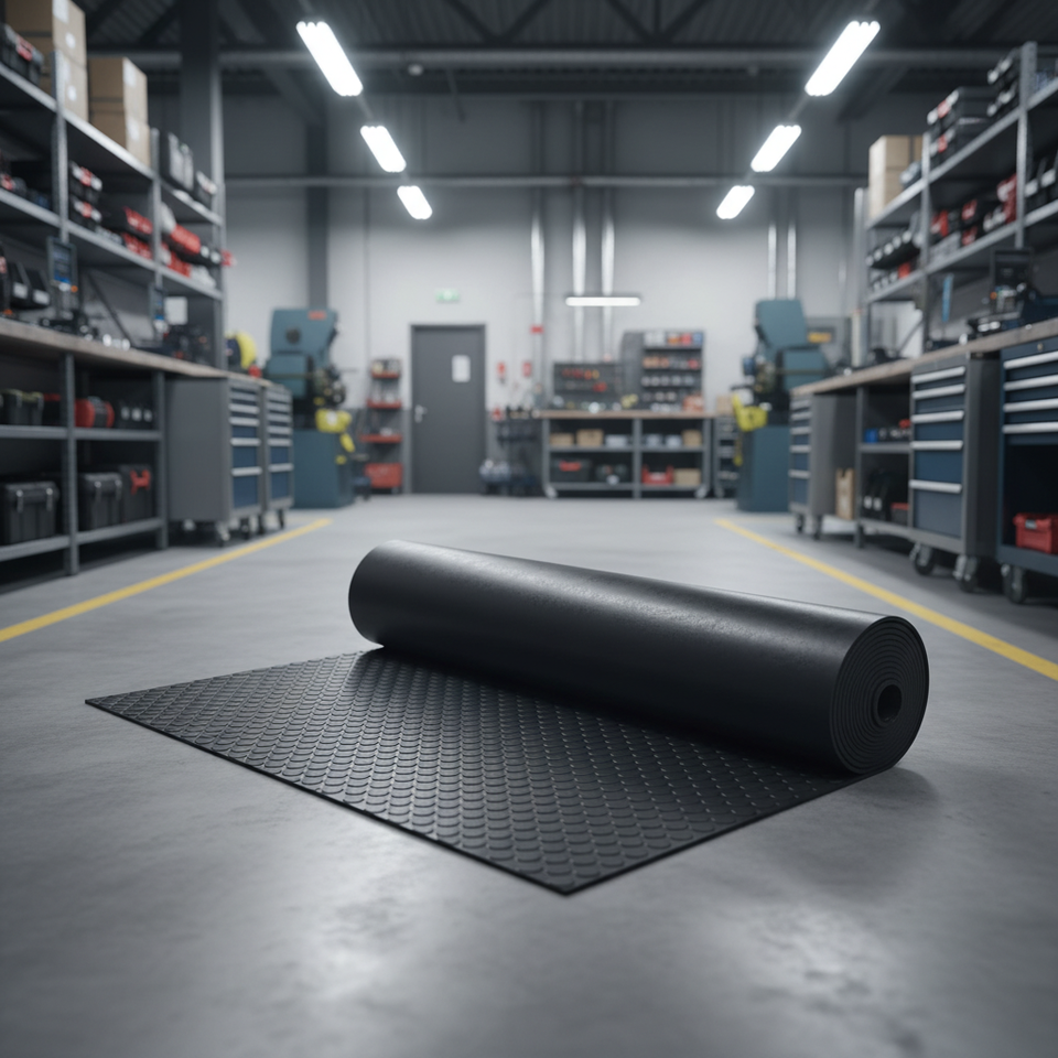 Black rubber flooring mat roll with textured surface for anti slip safety durable use in industrial gym workshop and commercial