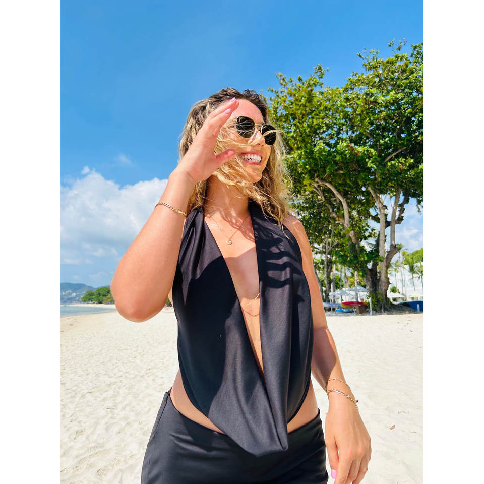 Black satin mega cow lick halter neck top backless tie up with gold chain front