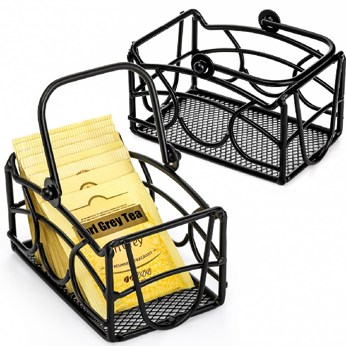 Black wire mesh tea bag/sweetener steel sugar caddy basket with handle is available at wholesale prices.