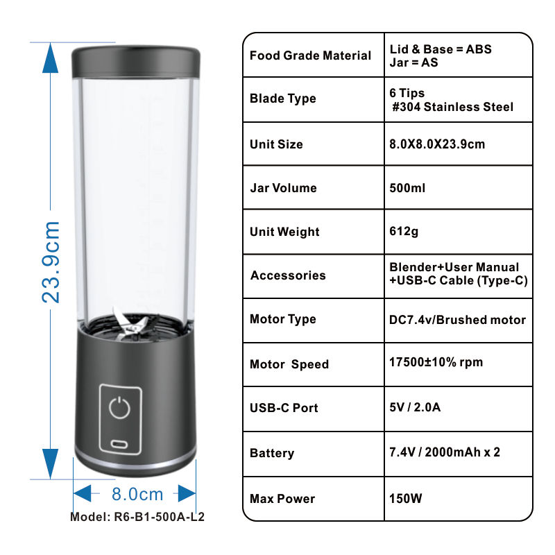 Blender Machine 500ML USB Rechargeable Portable Juicer 150W Powerful Electric Mini Mixer Kitchen Appliances Smoothie Maker