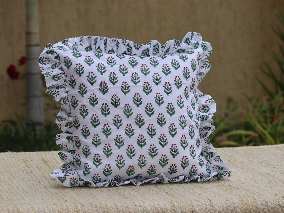 Block Print Boho Cushion Cover With Frill Handmade Cotton Bed Throw Pillows, bohemian pillow cushion cover vintage home decor