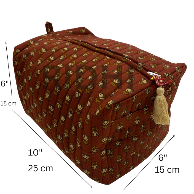 Block Printed Floral Rust Meadow Eco-Friendly Quilted Zipper Tote Bag Reusable Multi-Purpose Cosmetic Shopping Daily Use