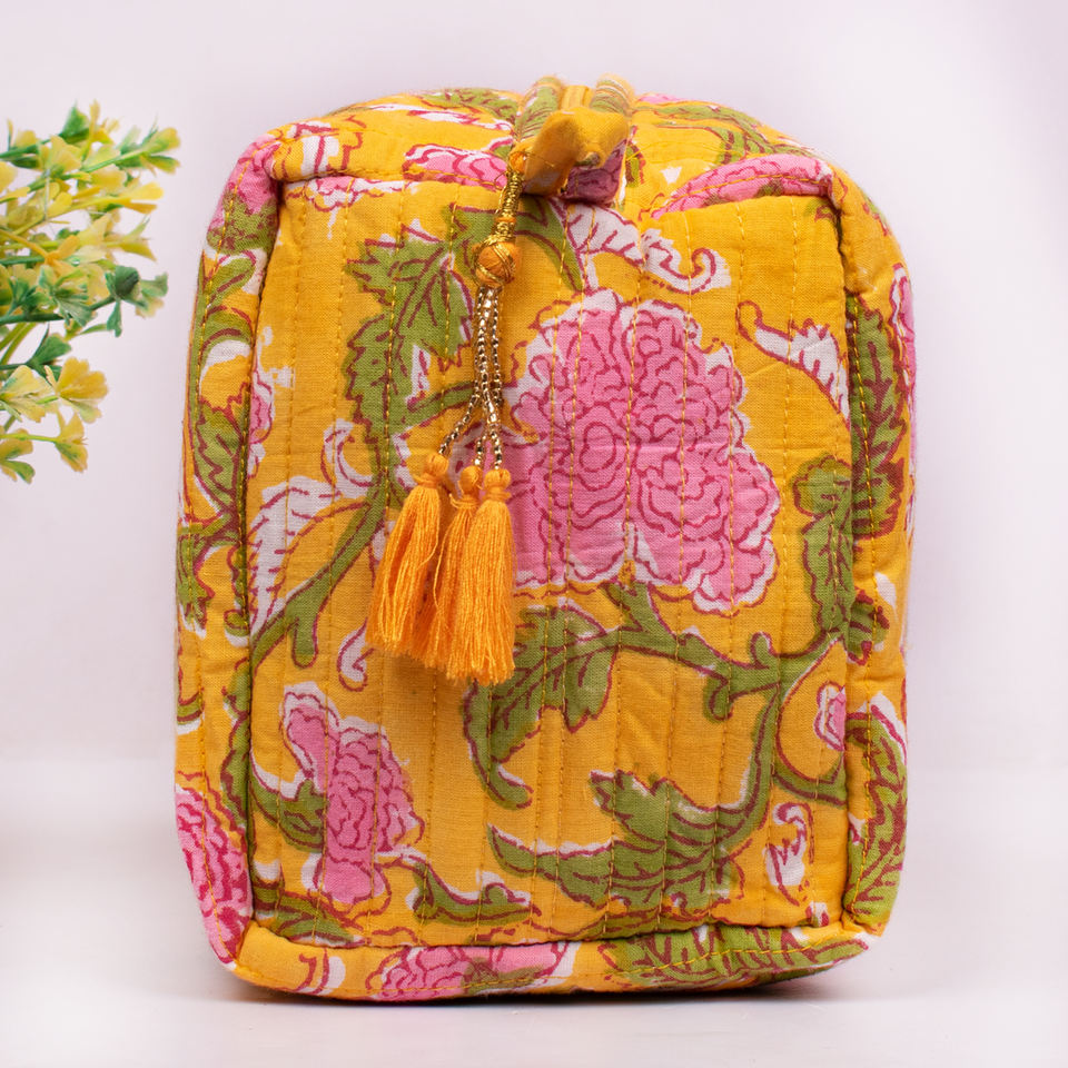 Block Printed Quilted Eco-Friendly Summer Unisex Travel Portable Washable Storage Zipper Pouch Organizer Large Cosmetic Bag