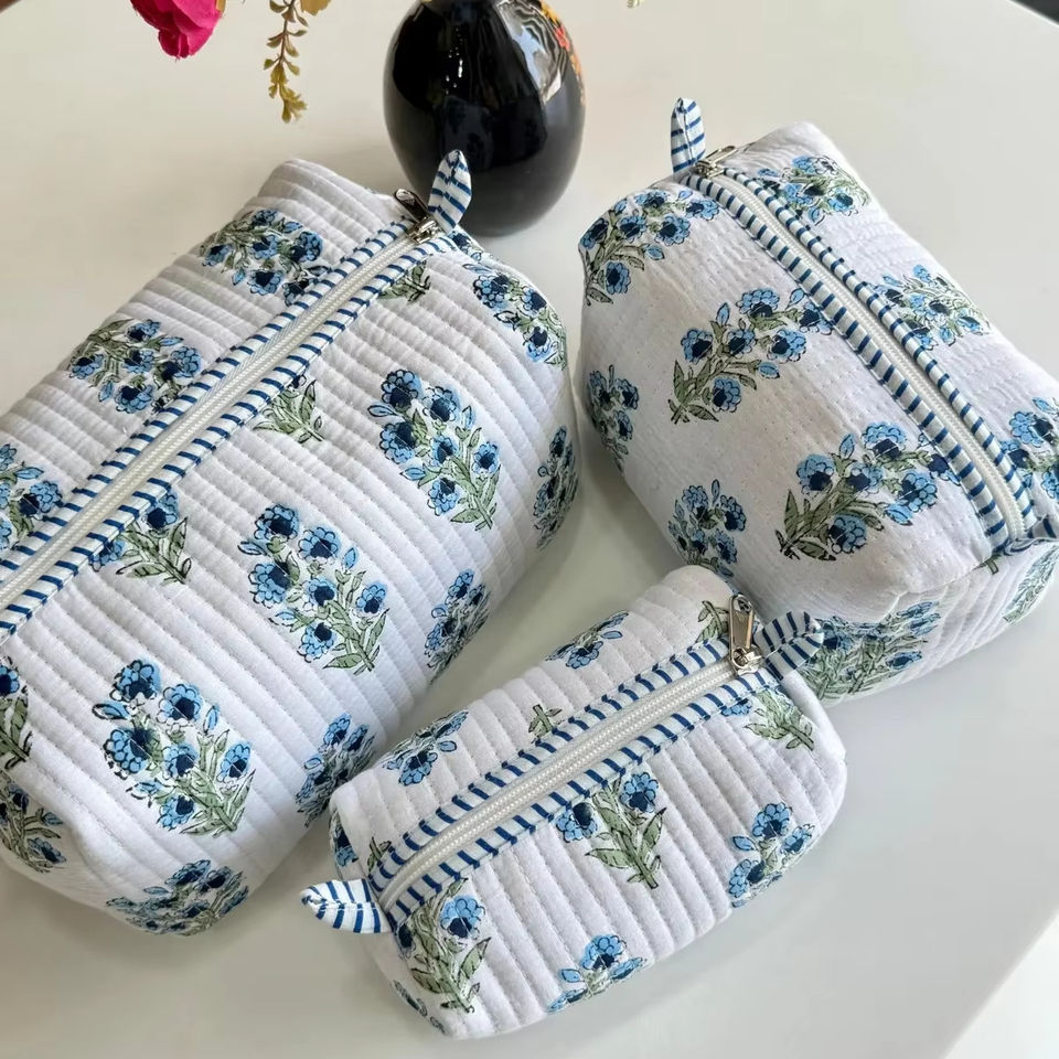 Block Printed Toiletry Makeup Pouch Set Quilted Cotton Zipper Bags with Tassel Accents for Travel Personal Care Storage