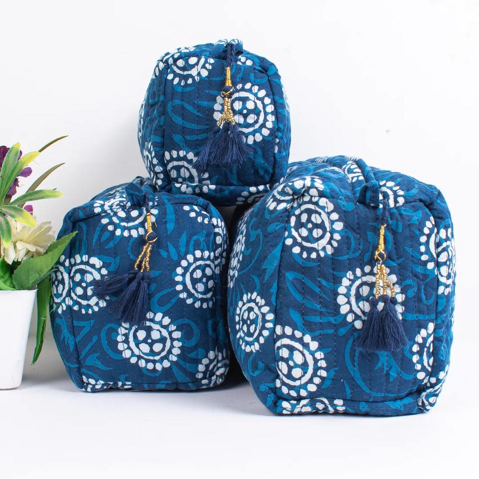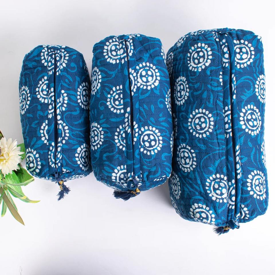 Block Printed Vintage Eco-Friendly Durable Large Water Resistant Zipper Cotton Case Bag Makeup Cosmetic Travel Pockets Assorted