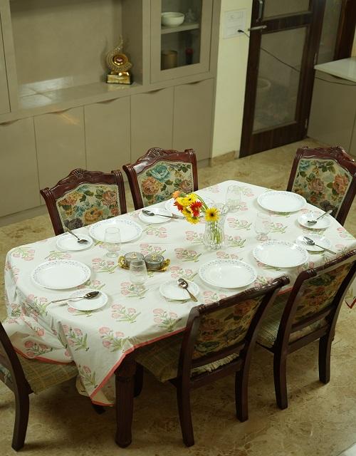 Block Printed Woven White Cotton Tablecover with Poppy Floral Design Waterproof & Eco-Friendly Home Decor for Table Covering