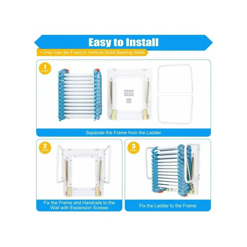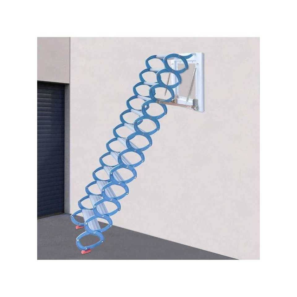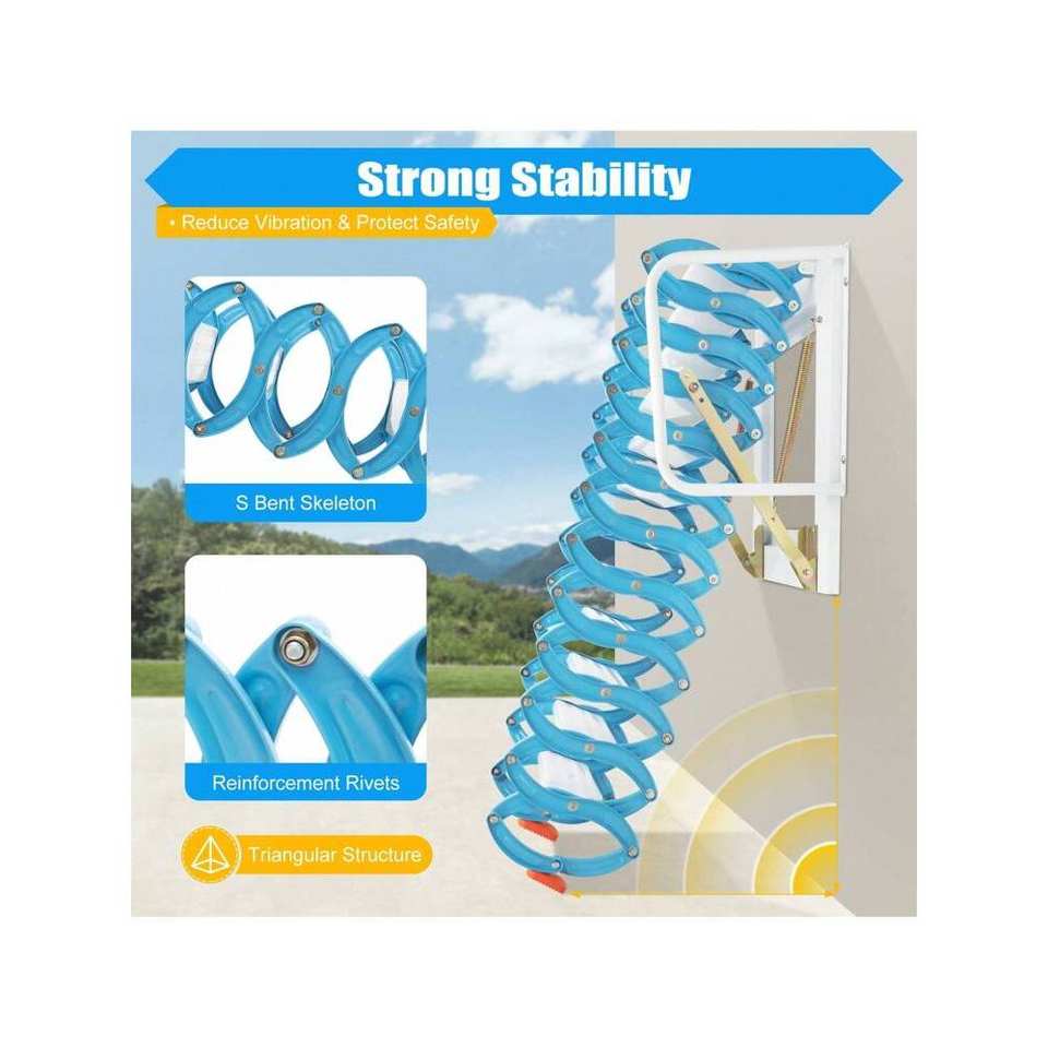 Blue 12-Step Pull Down Attic Stairs Alloy Access Ladder Wall-Mounted Folding Staircase for Home Use