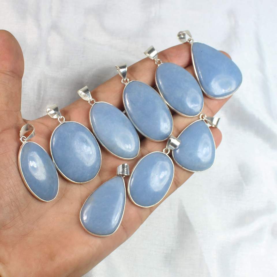 Blue Angelite Cabochon Pendant Silver Plated Loose Gemstone Necklace with Bezel Setting Wholesale Jewelry
