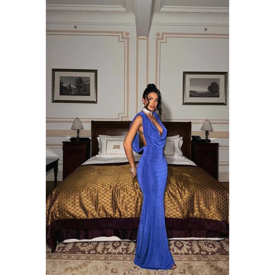 Blue Basic Ball Gown Dress Slit Detail Short Sleeve Long Floor-Length Evening Prom Quinceanera Party Style Available XS XL Sizes