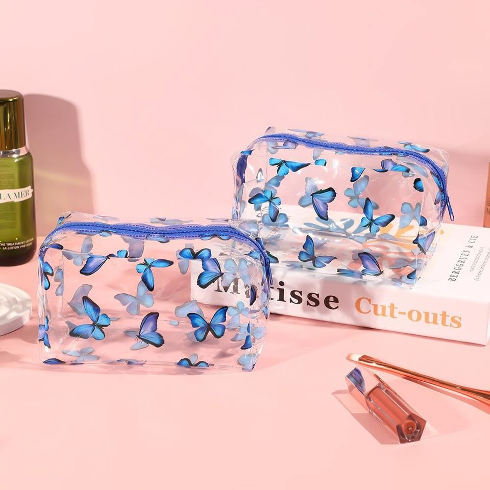 Blue Butterfly Transparent Makeup Bag Medium Size PVC Waterproof Cosmetic Storage Case Large Capacity Travel Toiletry Bag