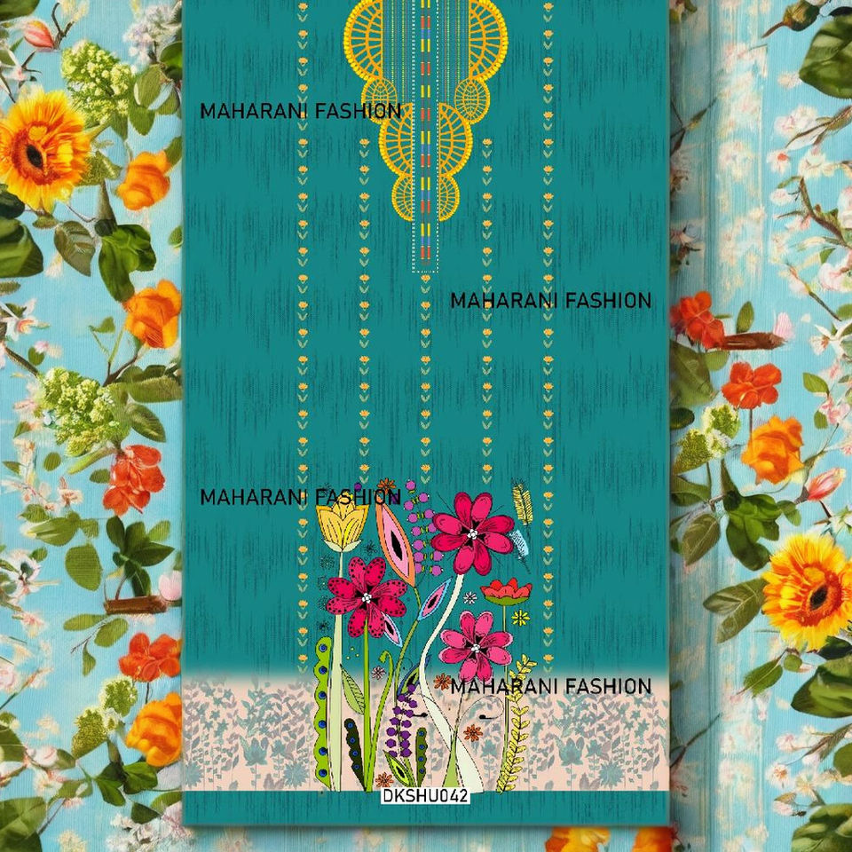 Blue Garden Flowers Printed Dress for Girls and Women Fancy Border Mixed Fabric