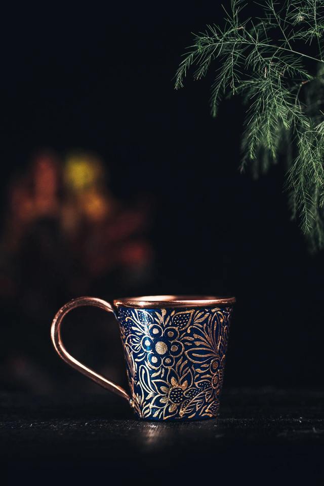 Blue Copper Mug with Gold Floral Design Elegant Handmade Drinkware Stylish Multipurpose Mug for Coffee Tea Juice From India