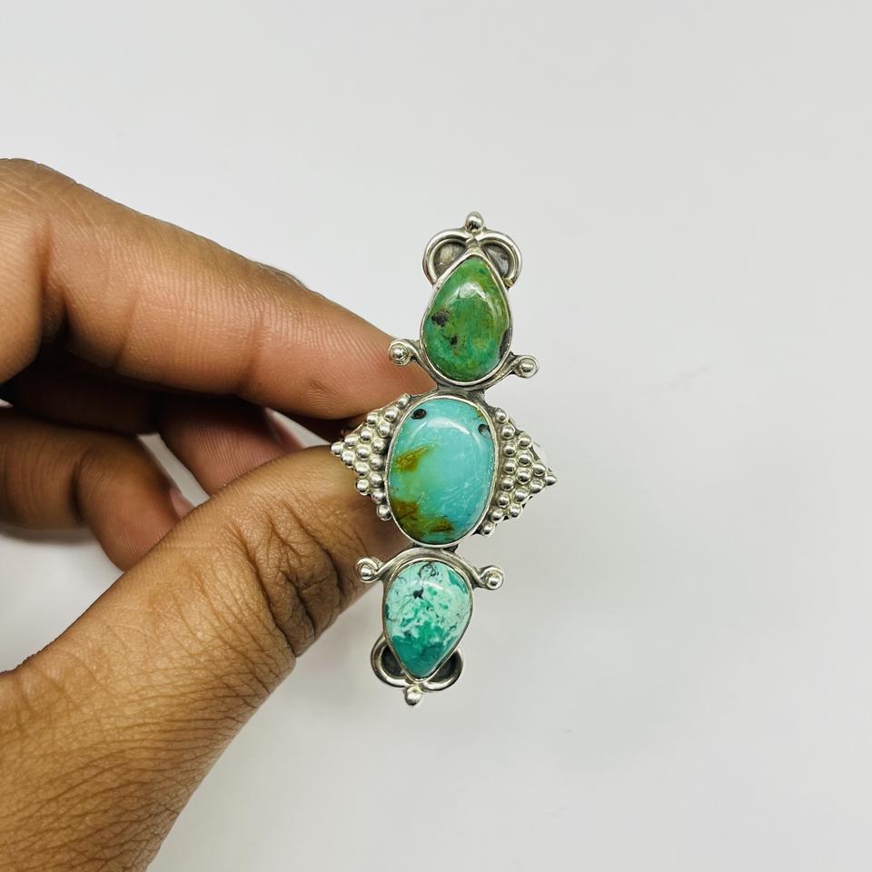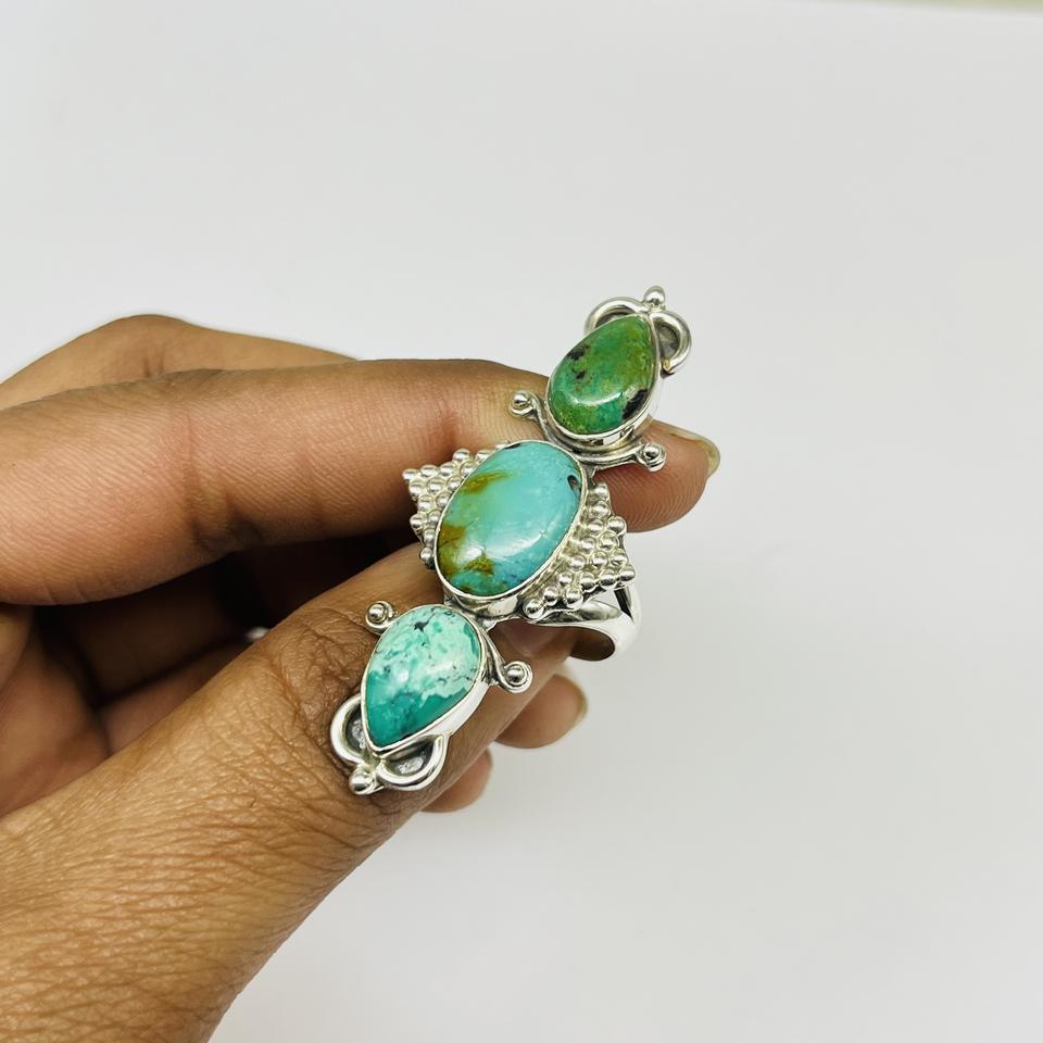 Blue Copper Turquoise Ring 925 Sterling Silver Ring Statement Ring 2 Stone Ring Three Band Ring Floral Ring Double Stone Ring