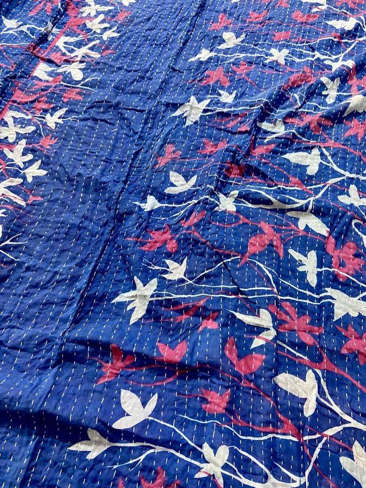 Blue Cotton Handmade Printed Kantha Quilt Vintage Bedspread Hotel Use Recycled Fabric Patchwork All-Season