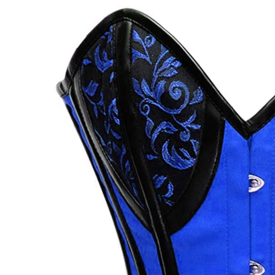 Blue Cotton Long Line Corset Top With Leather Boning Brocade Cup Corset