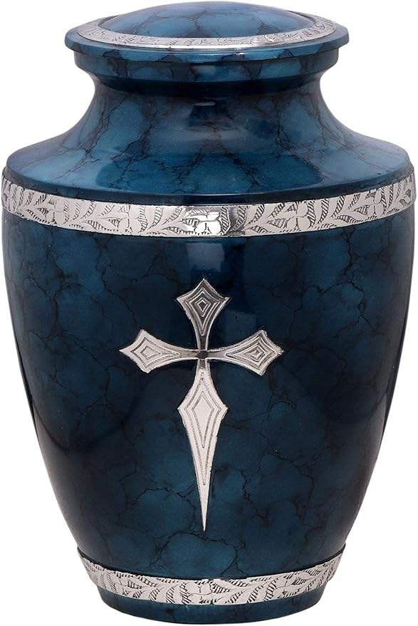 Blue Cremation Urn with White Religious Logo for Human or Pet Ashes Elegant Funeral Urn Christian Cross Emblem by AYAANS