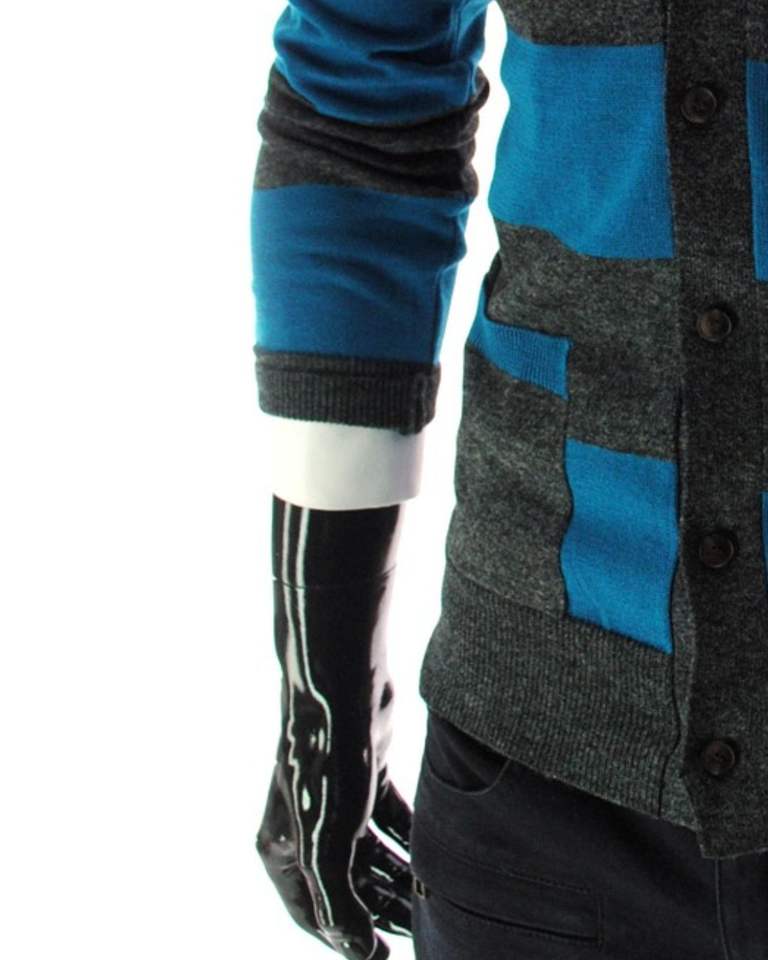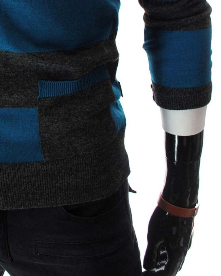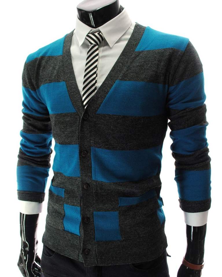 Blue Dark Grey Striped V Neck Knitted Cardigan Sweater With Button Closure And Soft Stretch Fabric Cotton For Winter Wear