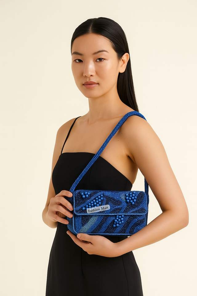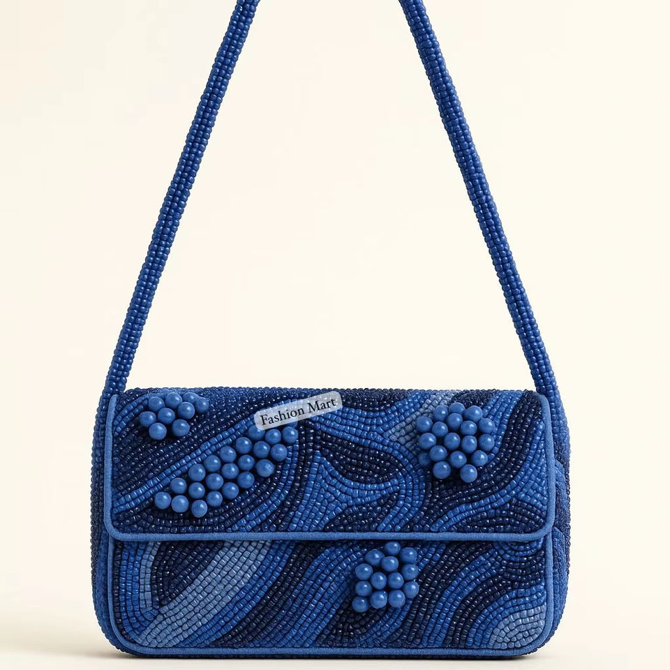 Blue Designer Beaded Hand Bag Handmade Purse With Intricate Bead Embroidery