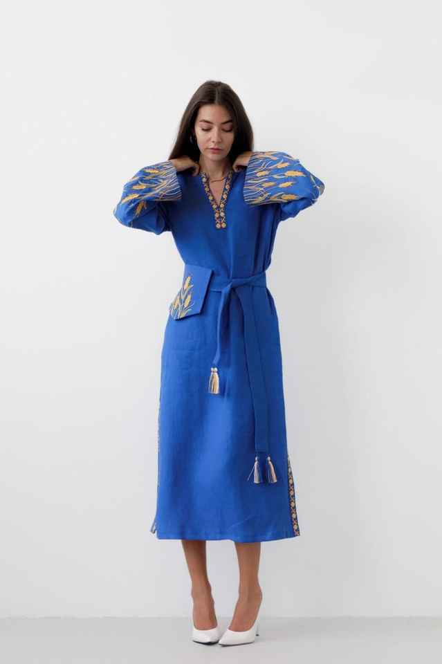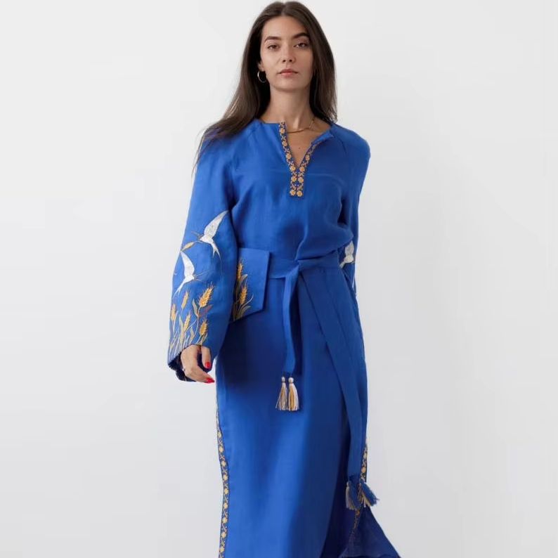 Blue Embroidered Ukrainian Vyshyvanka Linen Dress with Boho Folk Style Chic Free Cut Perfect Gift for Her from Ukraine Seller