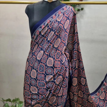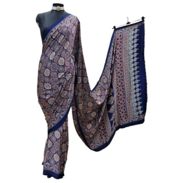 Blue Ethnic Clothing Printed Ajrakh Satin Crepe Saree Women Lightweight Wedding Ethnic Wear Sari Jewelry and other accessories