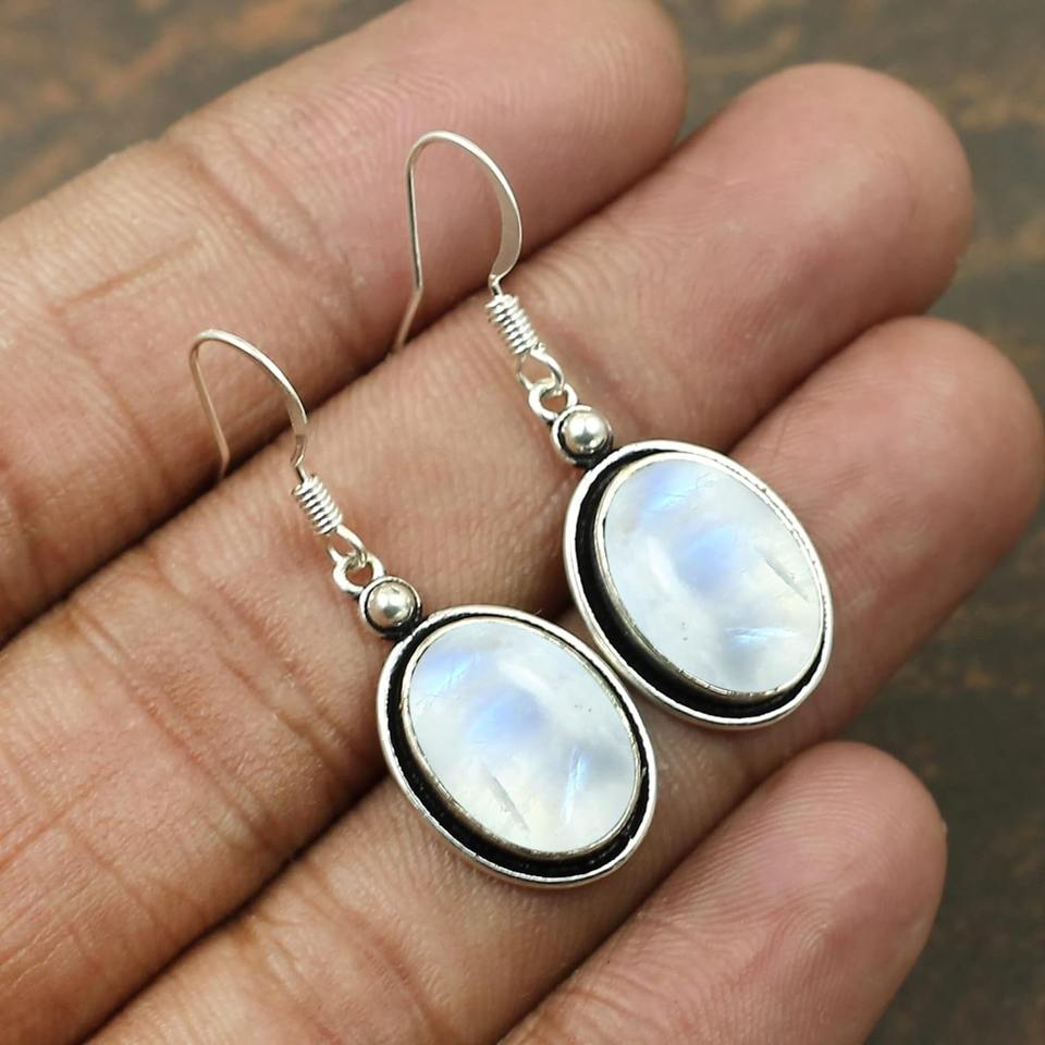 Blue Fire Moonstone Gemstone Earrings 925 Solid Sterling Silver Oval Shape Earrings for Women Dangle Silver Earrings Jewelry