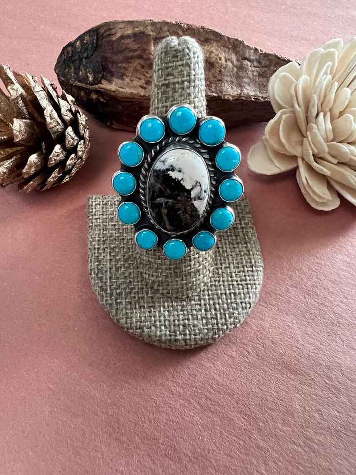 Genuine White Buffalo and Sleeping Beauty Turquoise 925 Sterling Silver Cluster Ring Adjustable Size