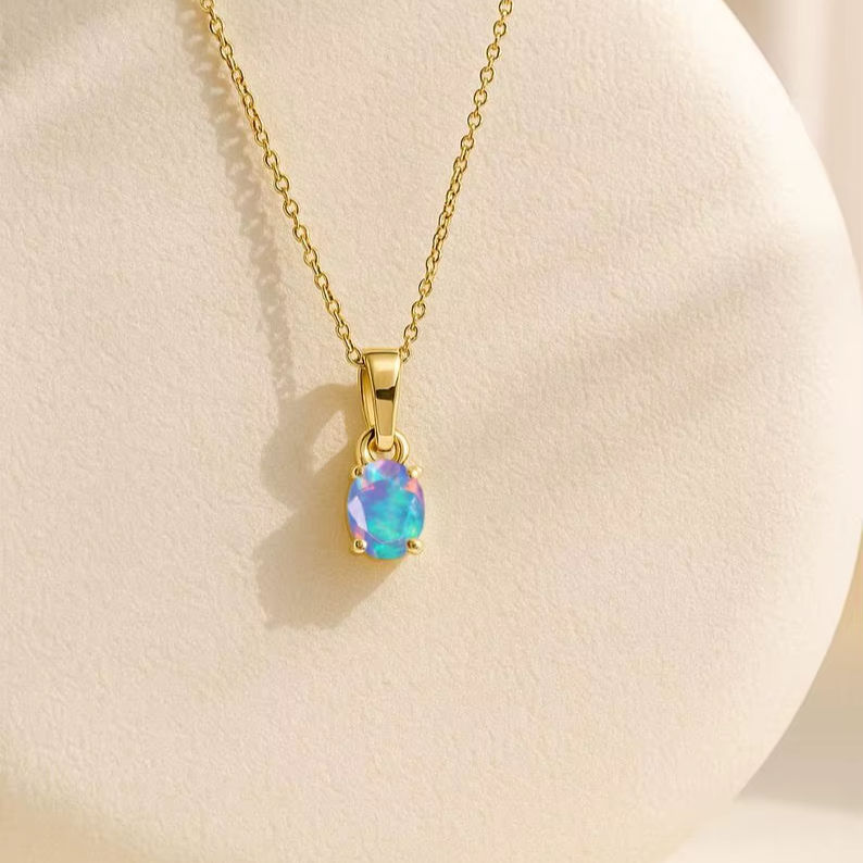 Blue Fire Oval Gemstone Pendant Ethiopian Opal Necklace 925 Sterling Silver Dainty Handmade Birthstone Jewelry Gift For Her