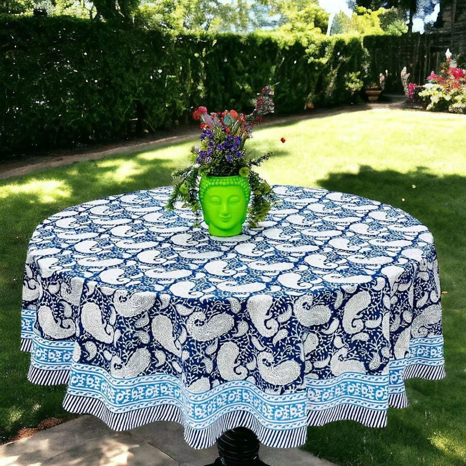 Blue Floral Print Hand Block Printed Pure Cotton Round Tablecloth Indian Farmhouse Wedding Round Table Cover for Home Use