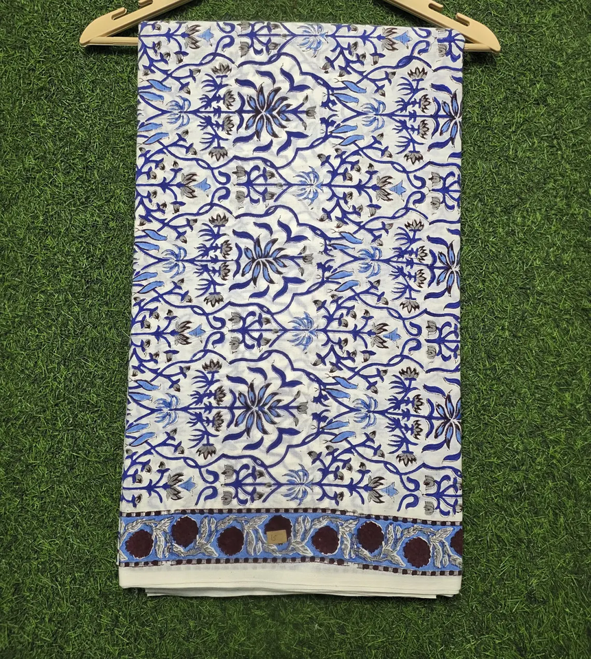 Blue Floral Print Knitted 100% Cotton Fabric Indian Handloom Lightweight Breathable Eco-Friendly 44 Yard Home Textiles Gift