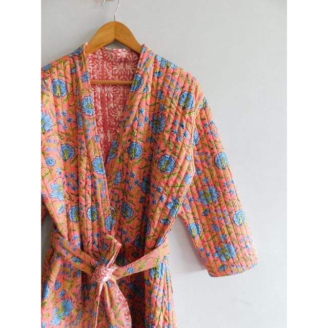 Blue Flower Hand Block Printed Cotton Quilted Kimono Bathrobe Coat Women Winter Wear Gown Jacket