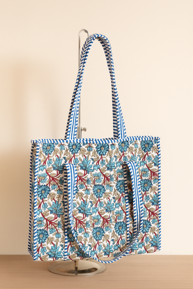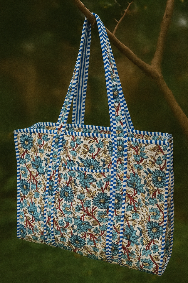 Blue Flower Print Quilted Cotton Tote Bag Zipper Fashionable Bohemian Design Winter Travel Shoulder Straps for Women Canvas Bag