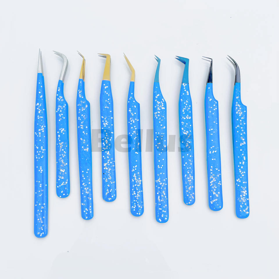 Blue Glitter Stainless Steel Eyelash Tweezers Set Custom Logo 45 & 90 Degree Volume Isolation Multiple Tip Styles