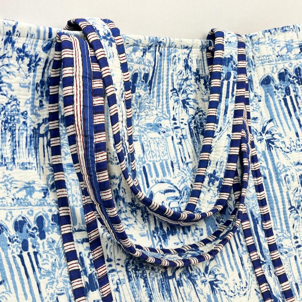 Blue Hand Block Printed Quilted Fashion Lady Tote Bag 100% Cotton Beautiful Functional Canvas Customizable Zipper Shoulder