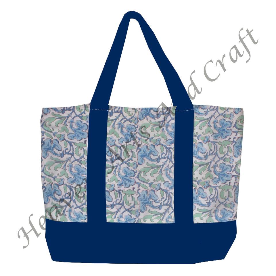 Blue Handle Hand Block Printed Tote Shopping Bag From India Multi-Hand Floral Design With Two Shoulder Straps Wholesale BHCB038
