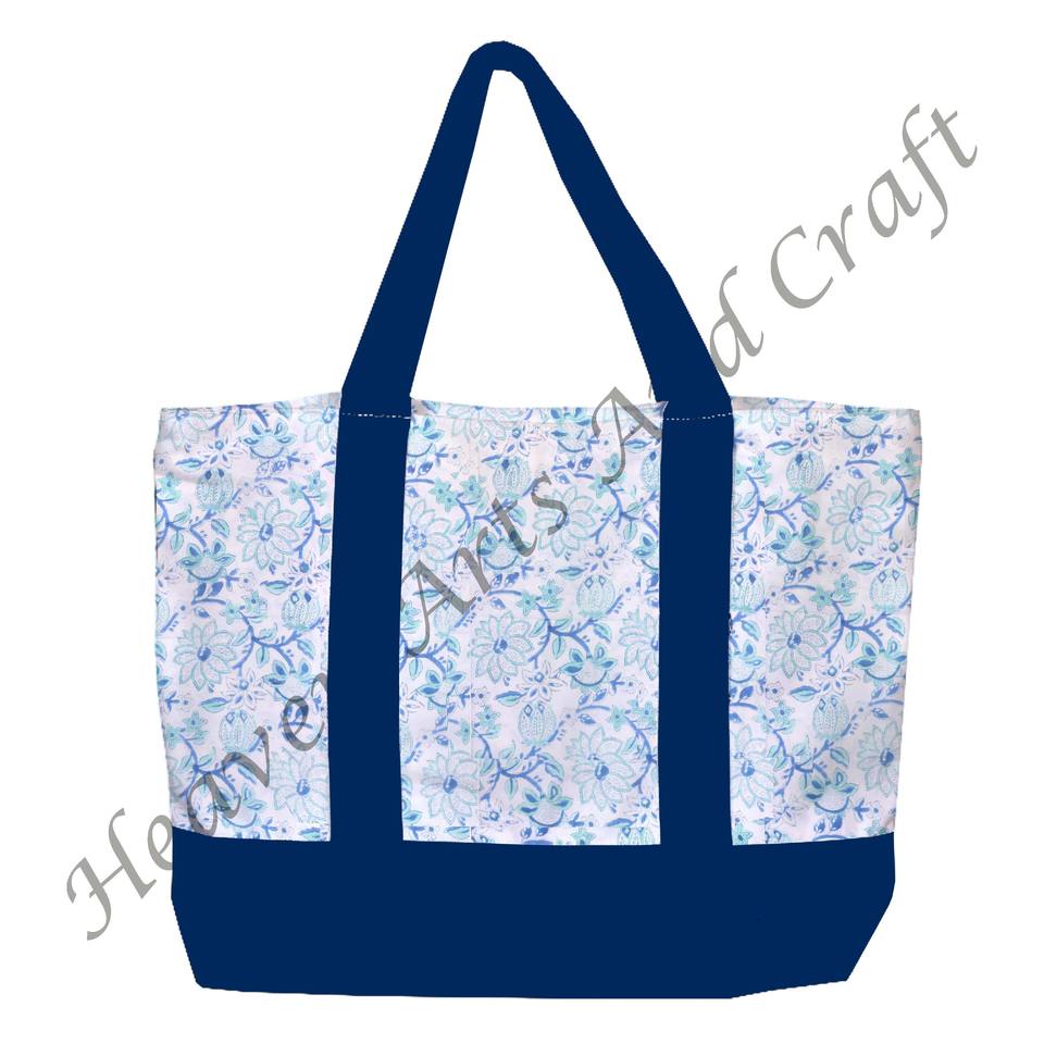 Blue Handle Hand Block Printed Tote Shopping Bag From India Multi-Hand Floral Design With Two Shoulder Straps Wholesale BHCB040