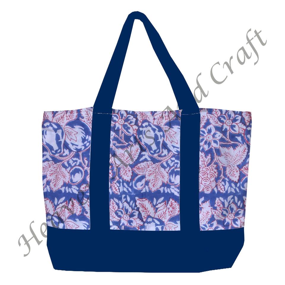 Blue Handle Hand Block Printed Tote Shopping Bag From India Multi-Hand Floral Design With Two Shoulder Straps Wholesale BHCB055