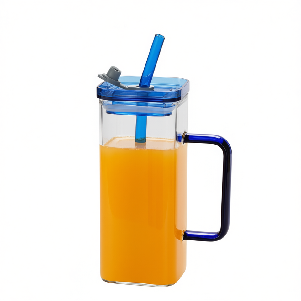 Blue High Borosilicate Square Glass Cup With Flip Straw Lid 600Ml For Office Tea Coffee Juice Gift