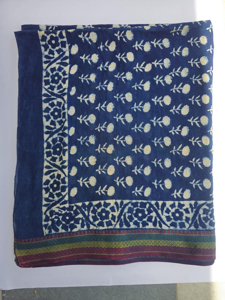 Blue Indigo Zari Floral Print Cotton silk border Women Beach Cover Up Sarong Hand Block Print Natural Hand Dyed in India Fabric