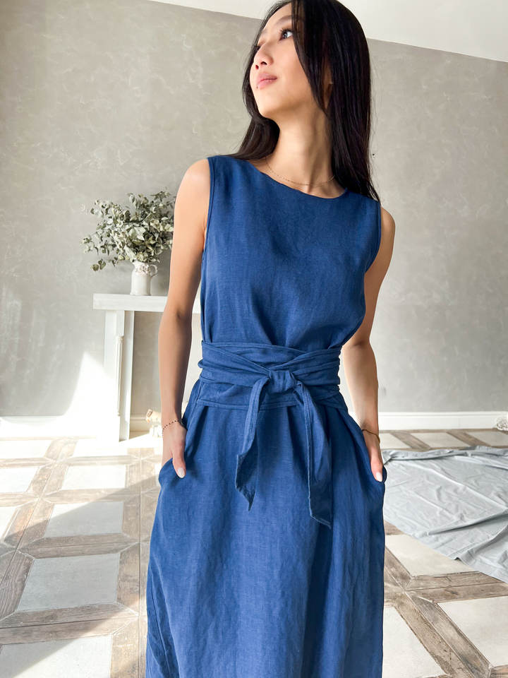 Blue Linen Wrap Maxi Dress for Women Sexy Plus Size Pinafore Boho Long Oversized Summer Wrap Dress Woven Weaving Method
