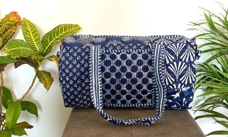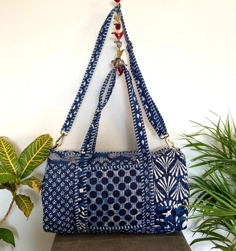 Blue Luxury Casual Sport Cotton Duffle Bag Quilted Fabric Weekender Travel Overnight Bag Large Capacity Tactical Zipper Closure