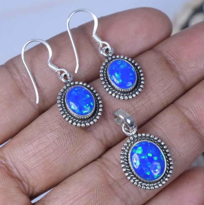 Blue Opal 925 Sterling Silver Gemstone Available Pendant Earring Set Jewelry Oval Shape October Birthstone Gift for Christmas