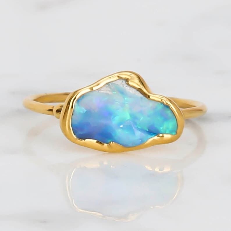 Blue Opal 925 Sterling Silver Women's Engagement Ring Fancy Cut Stone 14k Gold Plated Rhodium Plated Handcrafted Fine Jewelry