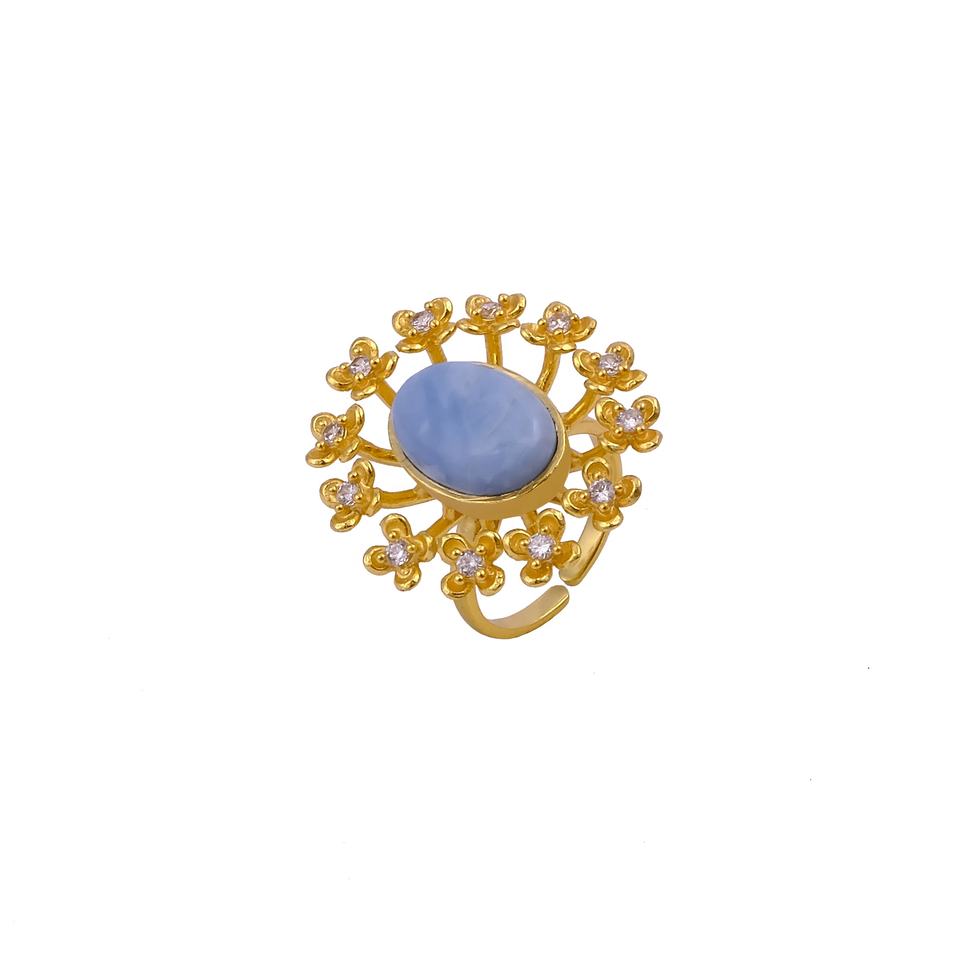 Blue Opal Gemstone Statement Adjustable Gold Plated CZ Floral Design Handmade Ring for Women Elegant Jewelry for Fashion Wear