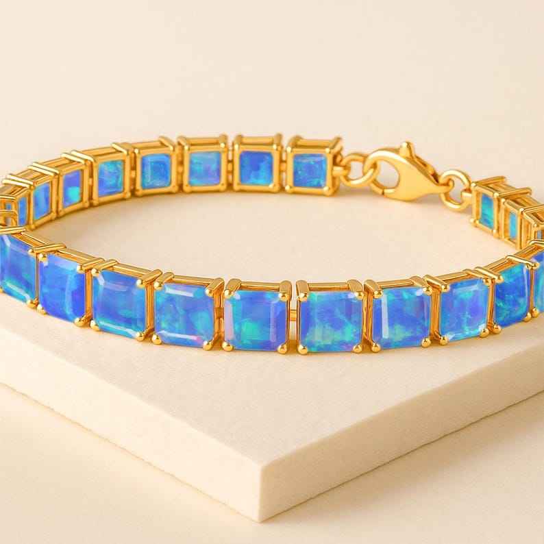 Blue Opal Octagon Tennis Bracelet 925 Sterling Silver 14K Gold Plated Fire Opal Gemstone Jewelry